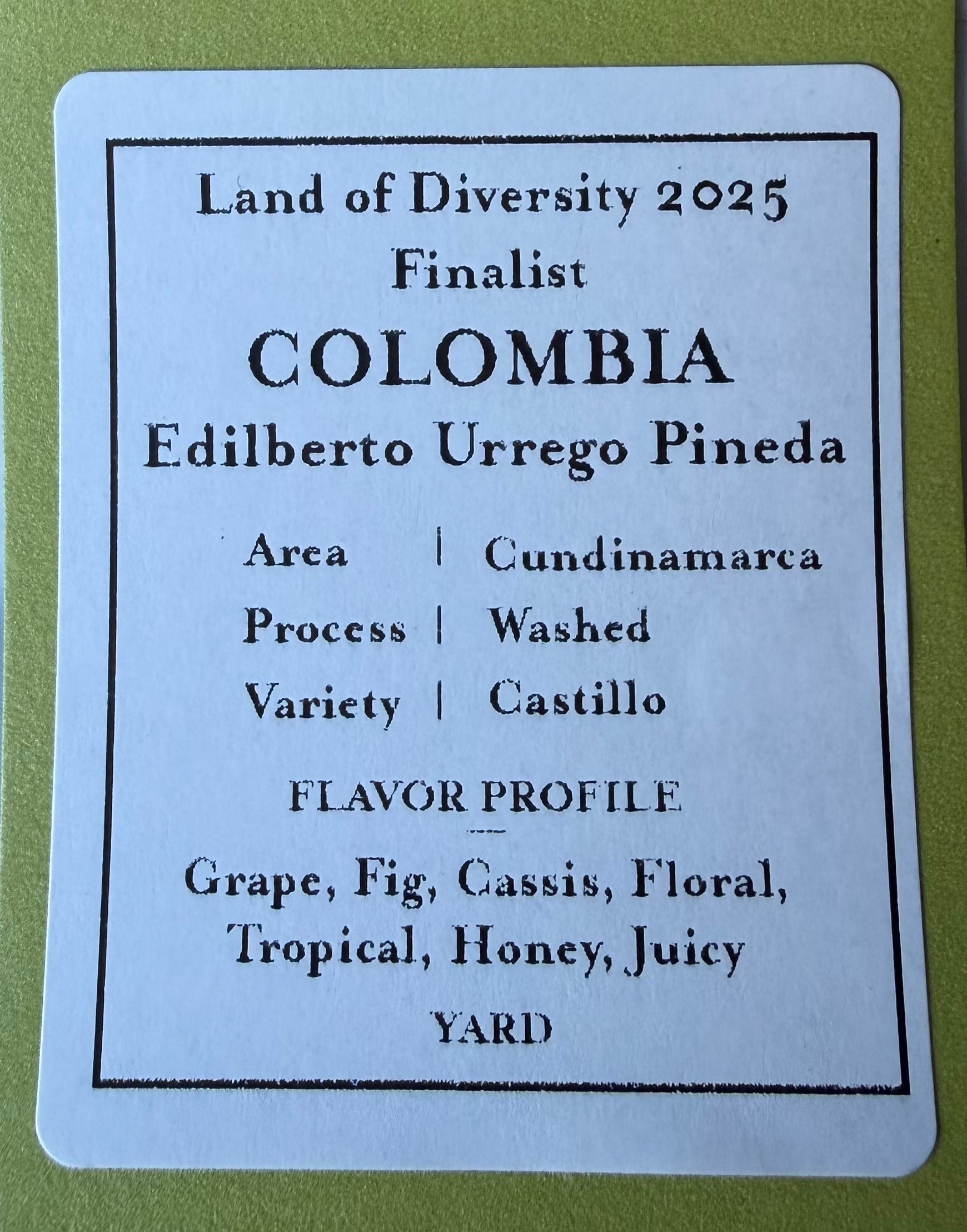 コロンビア産スペシャルティコーヒーの品質向上、生産者の努力の成果発信、そして最高品質のコーヒー生産の促進を目的とした品評会 Colombia Land of Diversity 2025 Finalist でファイナリストに選出されたロット。