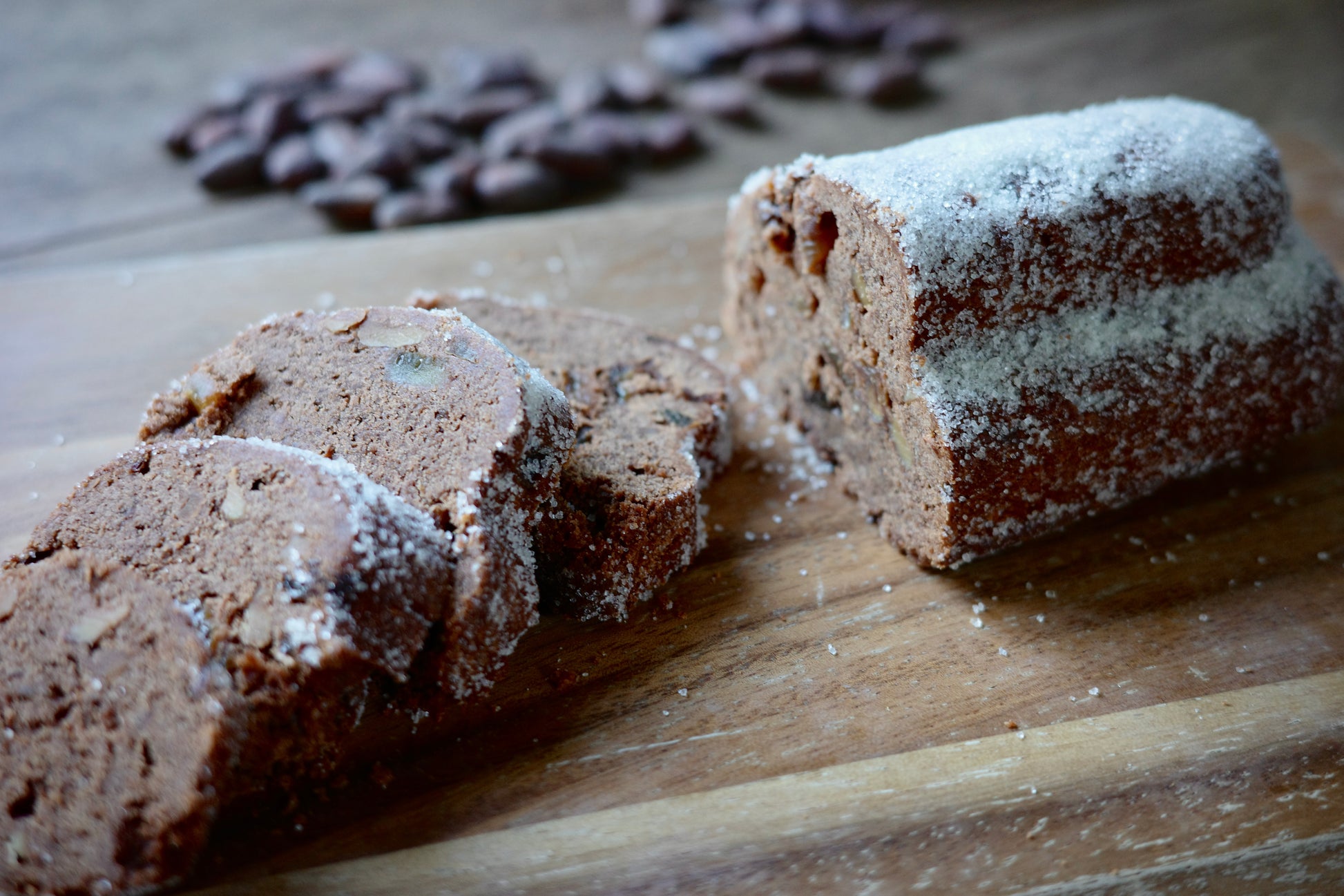 カカオ豆を仕入れて店舗内の工房で手作りしたクラフトチョコレートを贅沢に使用しました。カカオ豆の豊かなチョコレートの風味と、生地にはイチジク、オレンジ、レモン、レーズンなど沢山のドライフルーツとアーモンドを練り込みました。この時期限定のお菓子と共にクリスマスまでの特別な時期をお楽しみ下さい。