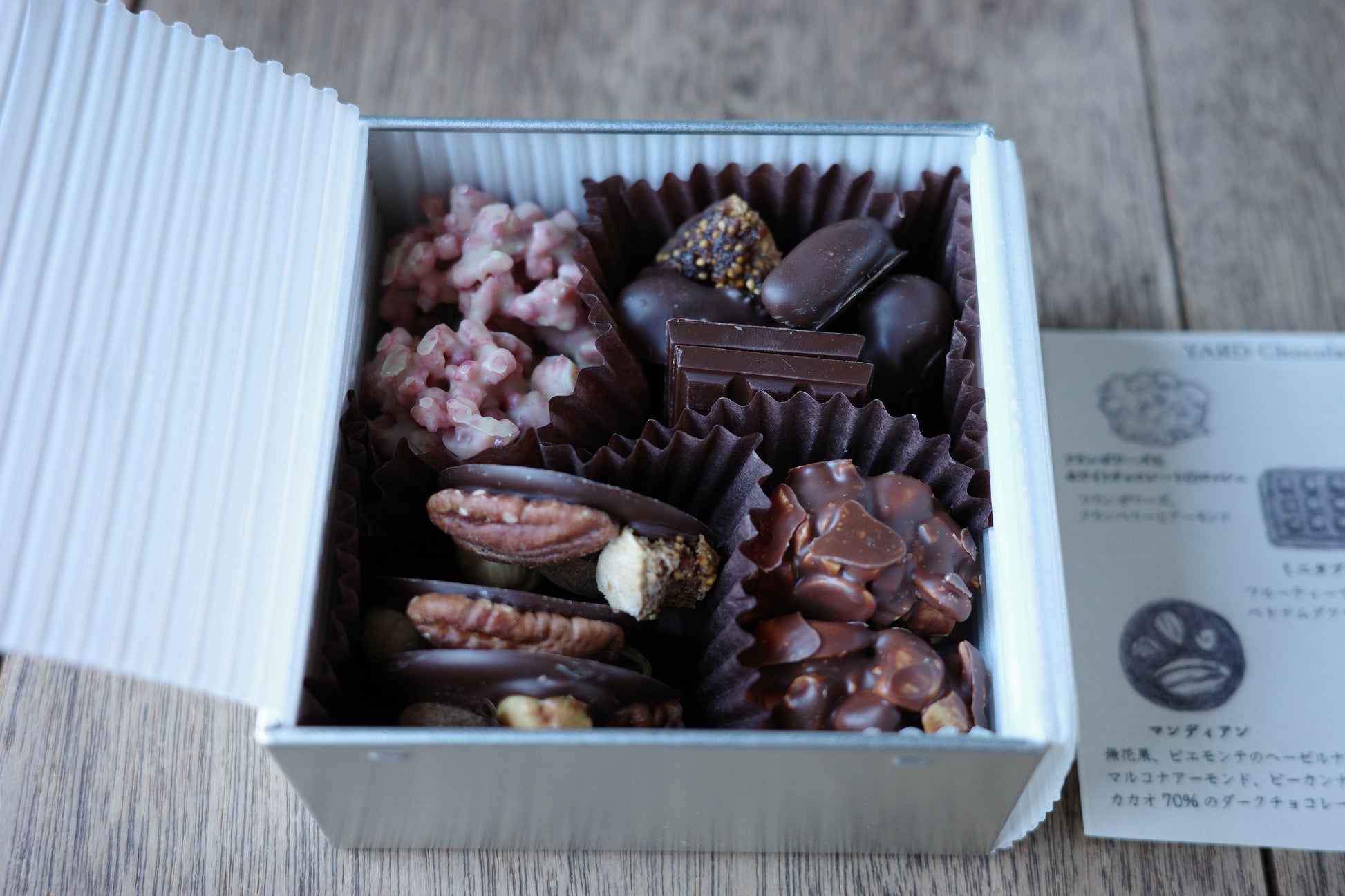 内容量:マンディアン 3個 ミニタブレットチョコレート 2個 イチジクチョコレート 4個 ホワイトチョコレートのロッシェ 2個 ミルクチョコレートのロッシェ 2個
